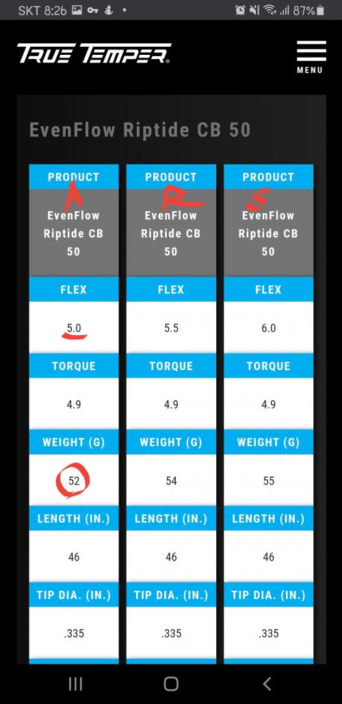 이렇게 하면 아시안스펙 스탁 5R~5SR 혹은 좀 부드럽게 나온 S 정도 되지 않을까 해서요. 과거 경험으로는 체감상 같은 플렉스의 샤프트는 미국스펙이랑 아시안스펙이 최소 1.5단계는 차이 났던것 같은데, EVENFLOW RIPTIDE CB 50G 5.5(R flex)는 아시안스펙 스탁 S 혹은 그 이상이 되지 않을까요?