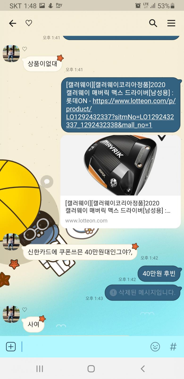 G400 MAX 가 주전인데 G425 Max 173 55S 쳐보고 훅구질이 너무 심해서 이틀만에 팔고 이 글 보고 매버릭 주문했습니다. 며칠 전 철 지난 로그서브제로 드라이버 쳐보니 훅이 안나오고 스트레이트로 뻣는 궤적을 보고 감동의 눈물이ㅜㅜ |