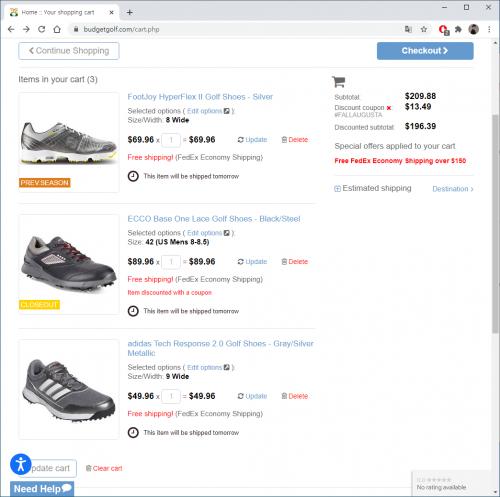 사실 사고 싶은건 에코였는데.... (아직 못신어봐서) 관세내로 맞추기 위해 풋조이 하나 담고, 저렴한 놈들 중에 그나마 괜찮게 보이는 아디다스로 하나 더 담았습니다. 아디다스는 스크린이나 연습장에서 신어야겠어요. 에코는 내년 라운딩에서 바로 개시하고, 풋조이는 그 다음에 신거나 아님 지인 선물해주거나 할 듯 합니다.