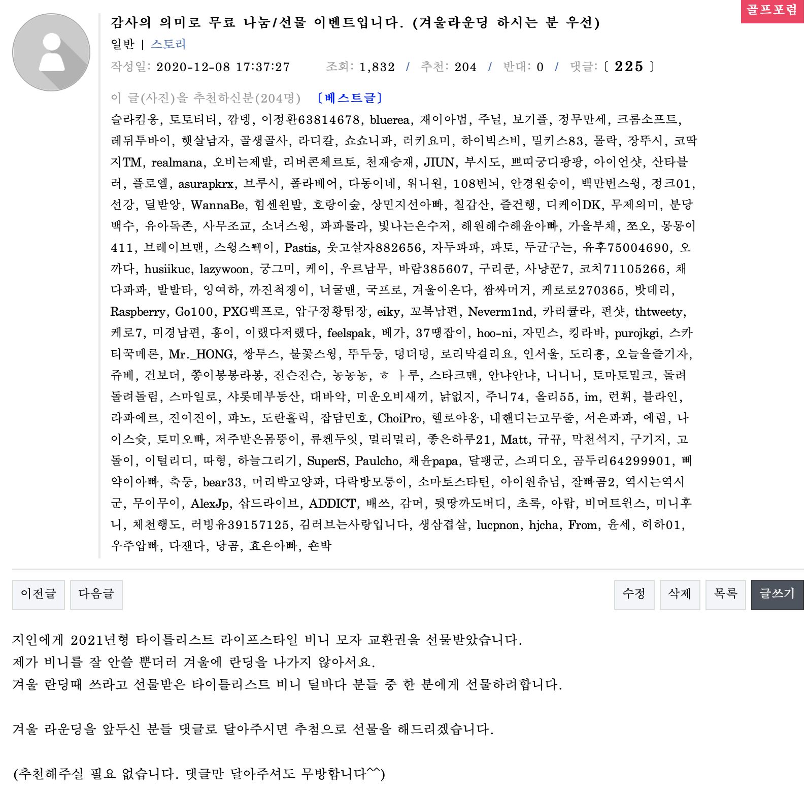 두 분은 이 글을 보시면 쪽지로 연락처 알려주세요~ 비니 선물 교환권 보내드리도록 하겠습니다.