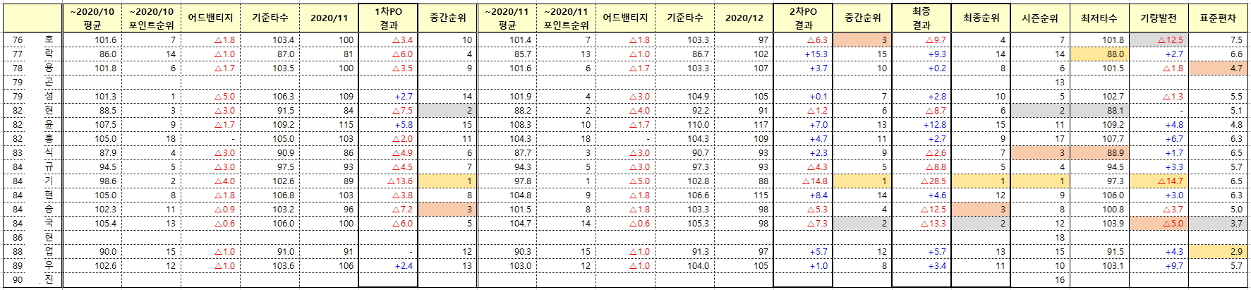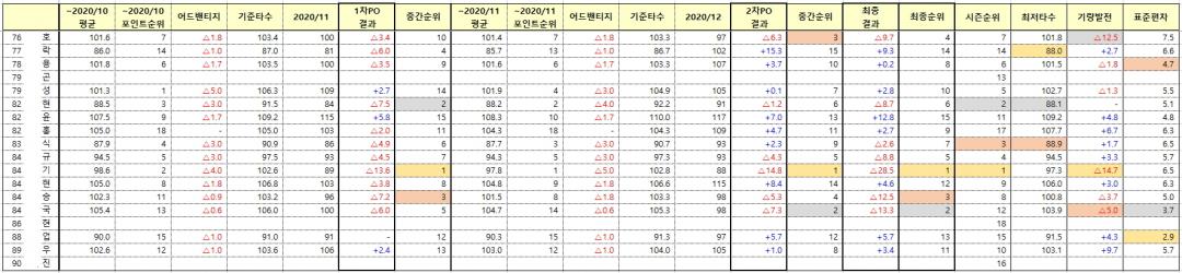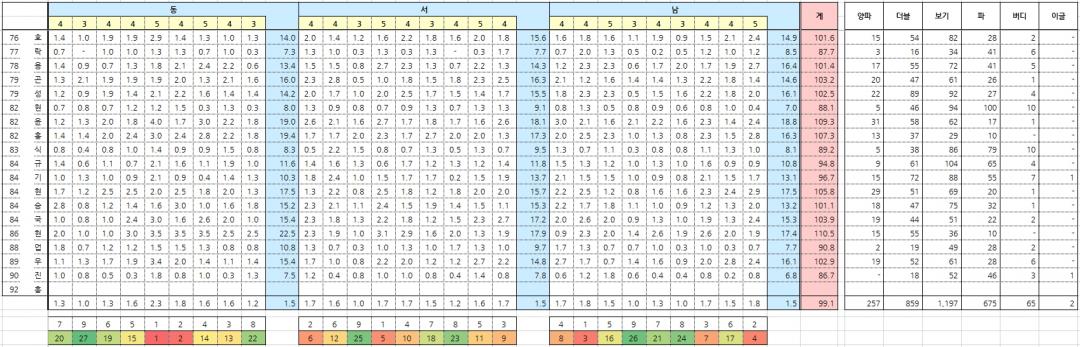 - 맨 첫달은 핸디대비 이런거 없이 갔고요, 2번째 달부터 직전월 스코어, 최근 2개월 스코어, 최근 3개월 스코어.. 뭐 이런식으로 반영했습니다.