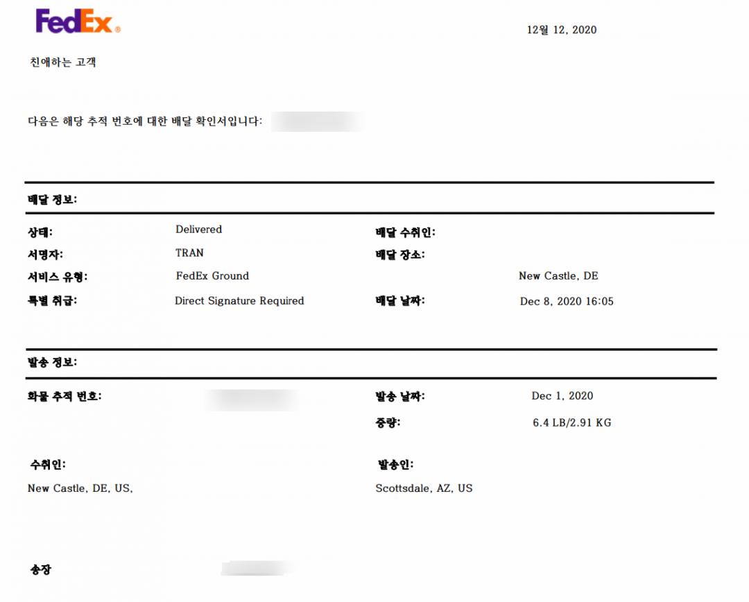 이렇게 왔고 FEDEX 배송증명에 보면 TRAN 이라고 서명되어 있는데,