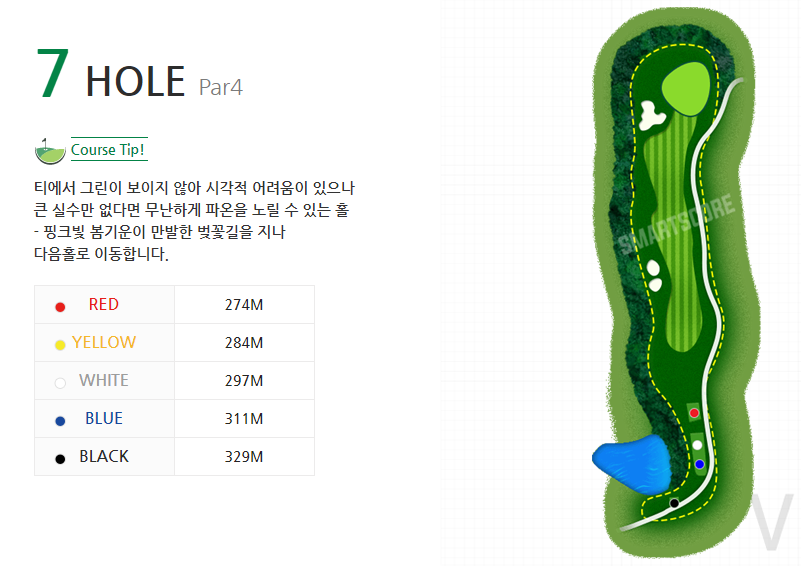 양산 동원 로얄 비스타 7번홀이었구요, 제원상 화이트에서 297M 라고 써있지만 다음지도로 거리 재보면 딱 그린 중앙까지 250M 나옵니다. 그린까지 쭉 오르막인 홀이었는데 1온...(은 그린 좌측 벙커 지나 러프에 있었네요) 했던 홀이에요.