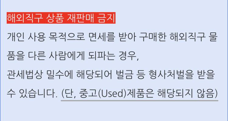 개인사용목적으로 관부가세면제받은 제품은 중고제품으로도  판매할수없습니다.