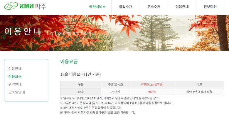 kmh에서 하는 골프장들 4월 주말그린피가 전부 다 그렇더라구요... 웃긴건 파주가 신라보다 비싸고.. 테제베도 골때리는 수준이고.. 좀 이해가 안갑니다. 그돈주고 칠만한 구장들이 아닌데.. |