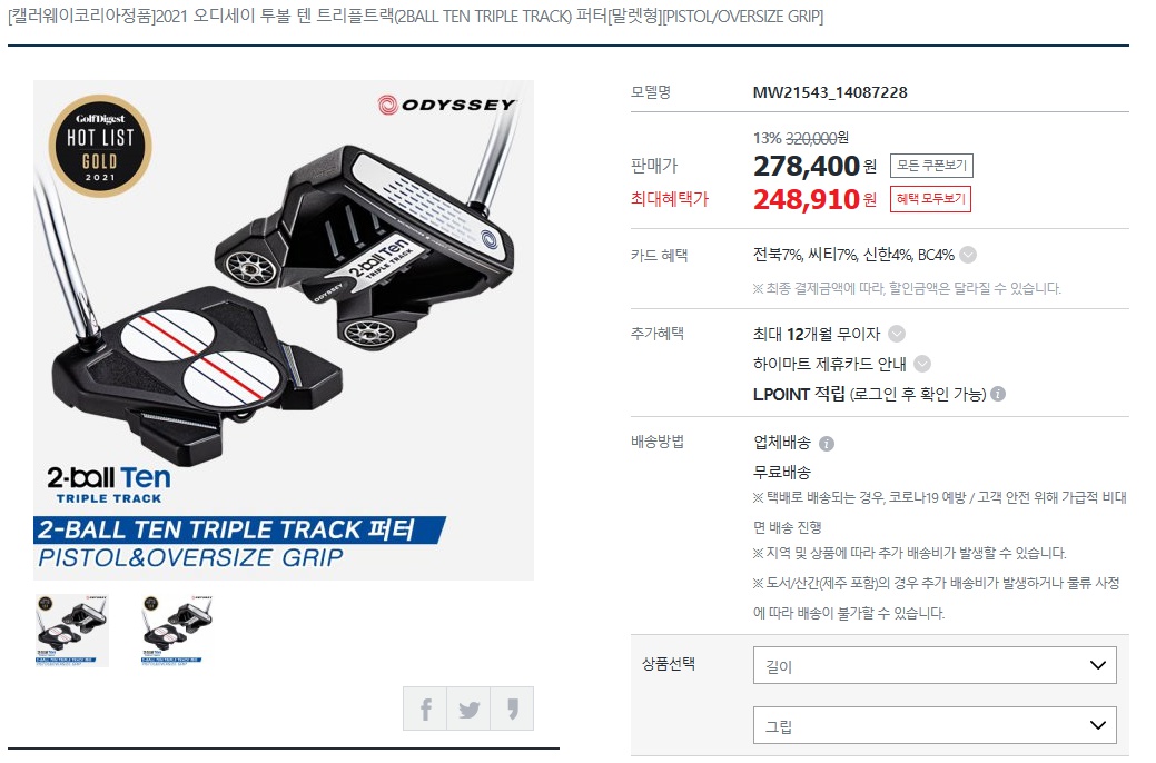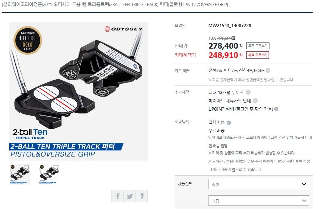 투볼 텐 트리플트랙 퍼터인데 쿠폰, 카드 할인이 적용되서 24.9만원 입니다.