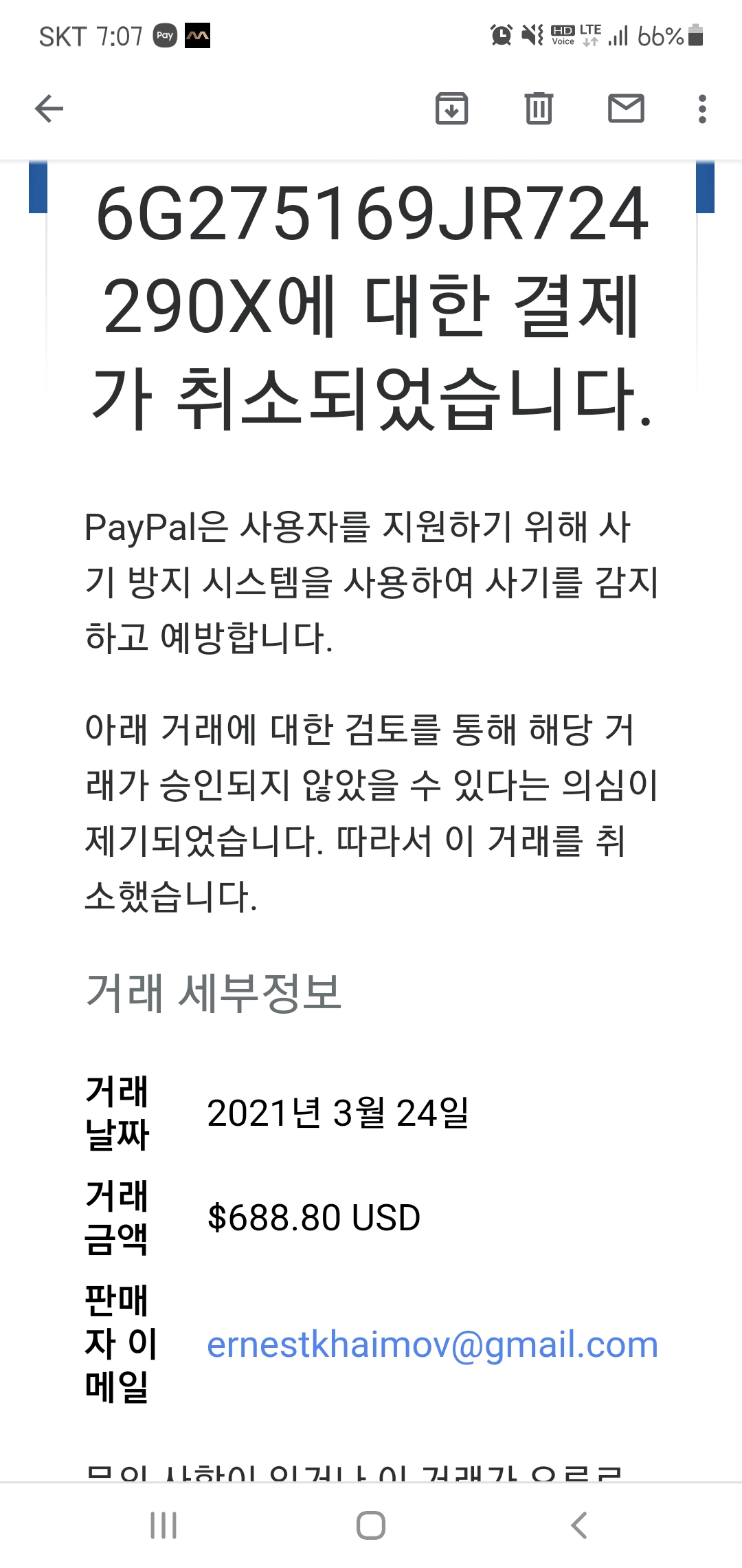 페이팔에서 결제된부분이니 페이팔에 승인취소를 요청해라고하더라구요
