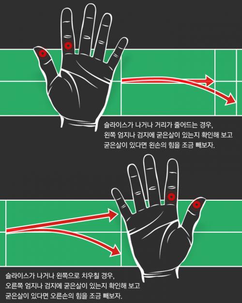 손에 힘이과도하게 들어가면 손목에 힘이들어가서 임팩트시 손목이 원상태로 돌아오지못해서 페이스가 열린채로 맞아서 슬라이스가 납니다.  힘좋은분들이 이런경우가 많은데요..