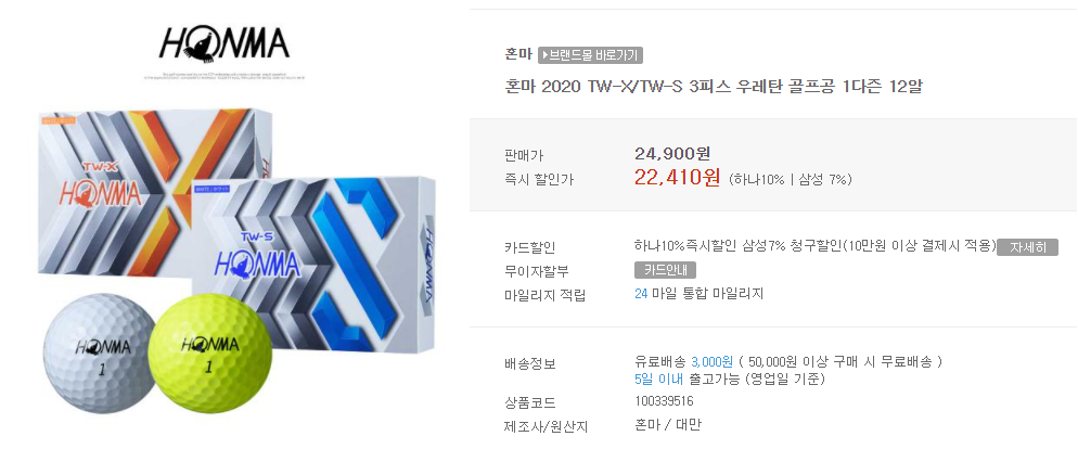 골프쇼핑은 골핑에서 | 혼마 2020 TW-X/TW-S 3피스 우레탄 골프공 1다즌 12알 (golfzon.com)