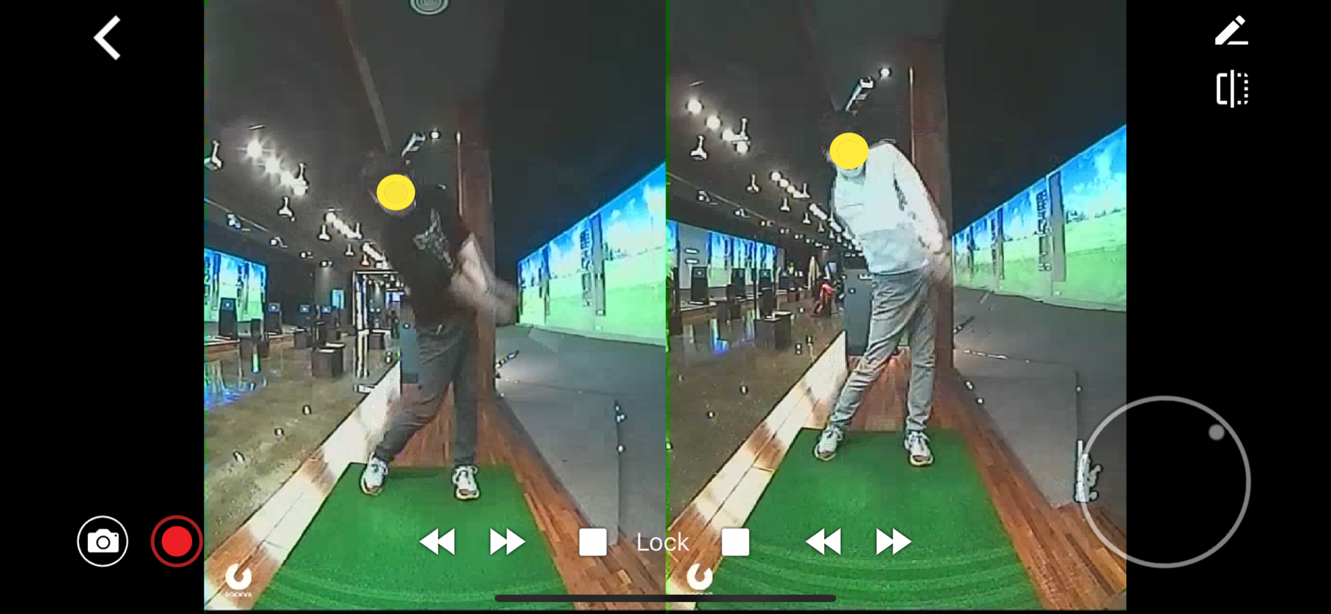 임팩트 직후 캡쳐사진에서 좌측은 나름 몸통스윙 (평소 제 스윙), 우측은 팔로만 내리는 스윙으로 해본건데요.