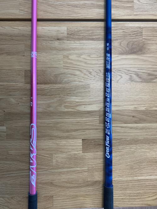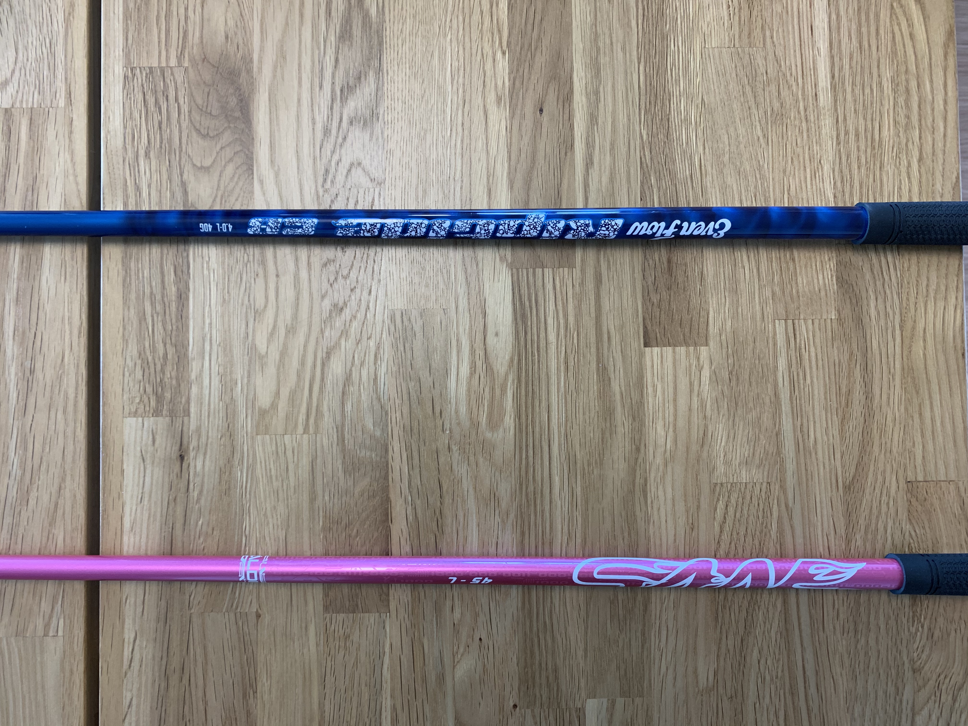 *핑크색 알딜라 샤프트는 무게가 45그램, 파랑색 이븐플로우 샤프트는 40그램입니다.