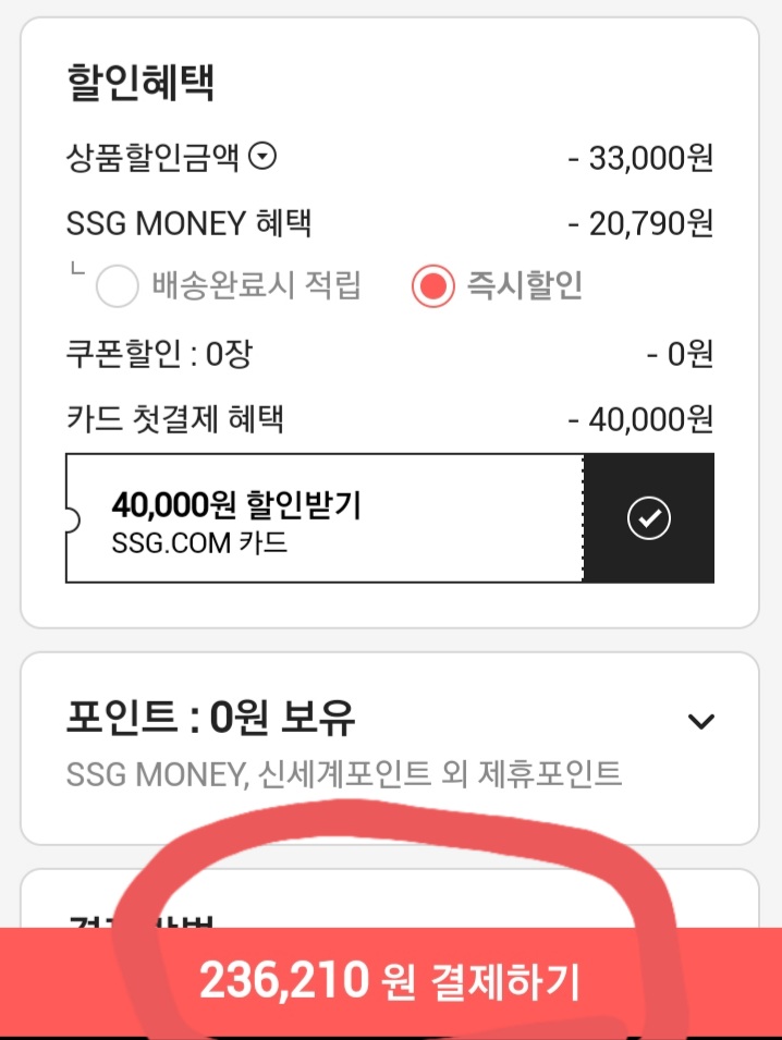 근데 여기서 즉시발급되는 카드 할인 4만원 받으니까 23만원대 나오네요..