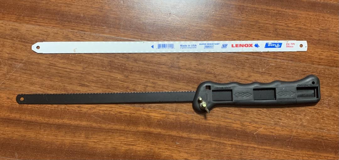미국 레녹스사의 300mm 24tpi 양날줄톱날과 메이드인 차이나 줄톱대 입니다. 대략 공구상가에서 5천원 정도에 구입이 가능 하십니다. 굳이 레녹스 아니라도 아무 톱날이건 적당한 사이즈의 양날톱이면 되는겁니다 ㅎ