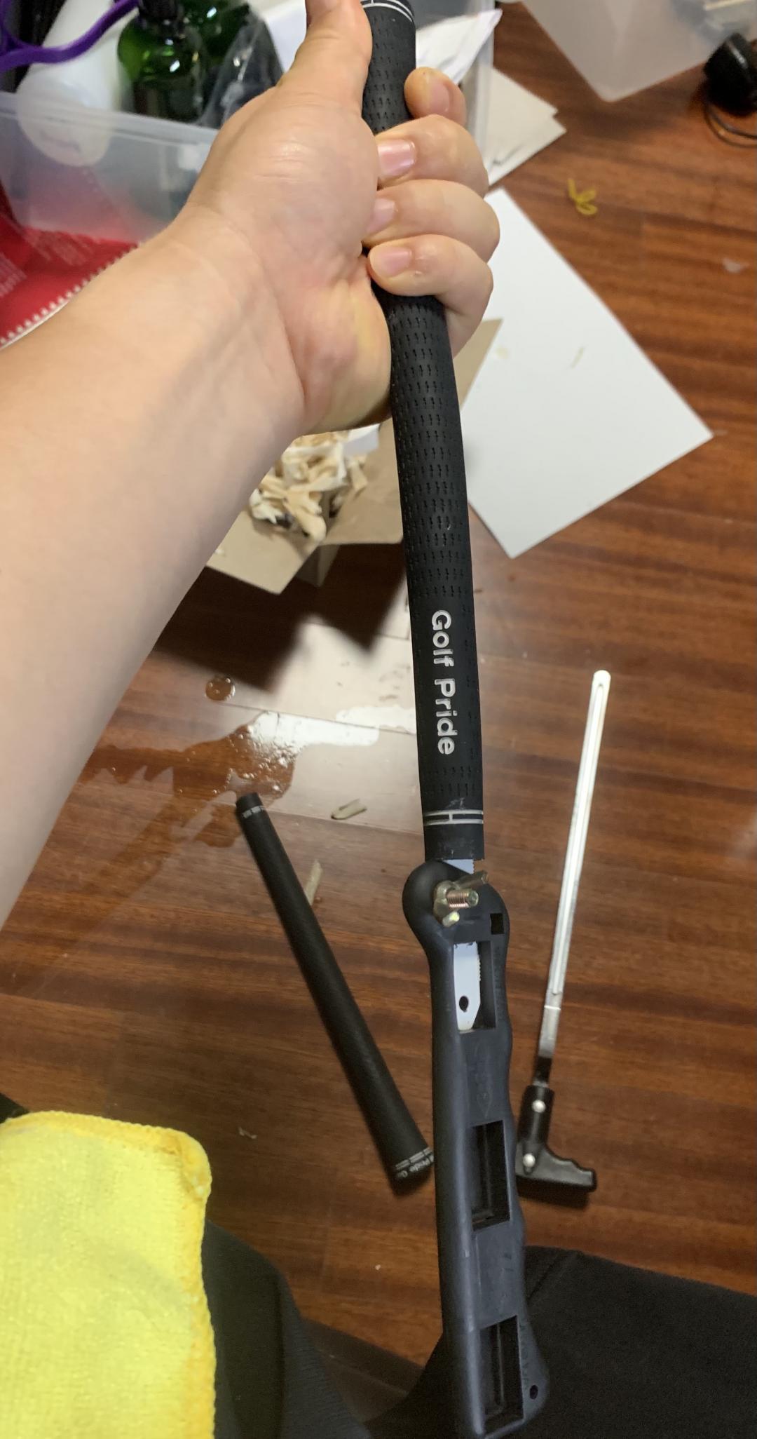 그립 아래 구멍에 티를 꽂고 솔벤트를 길게 한번 짜 넣은다음 위를 막고 살랑살랑 그립내부를 적셔줍니다. 최소 1~2분 정도 여유를 주시는편이 작업하기가 낫습니다. 유튜브따위를 보다 듣다 하시면 시간은 잘 갑니다 ㅎ