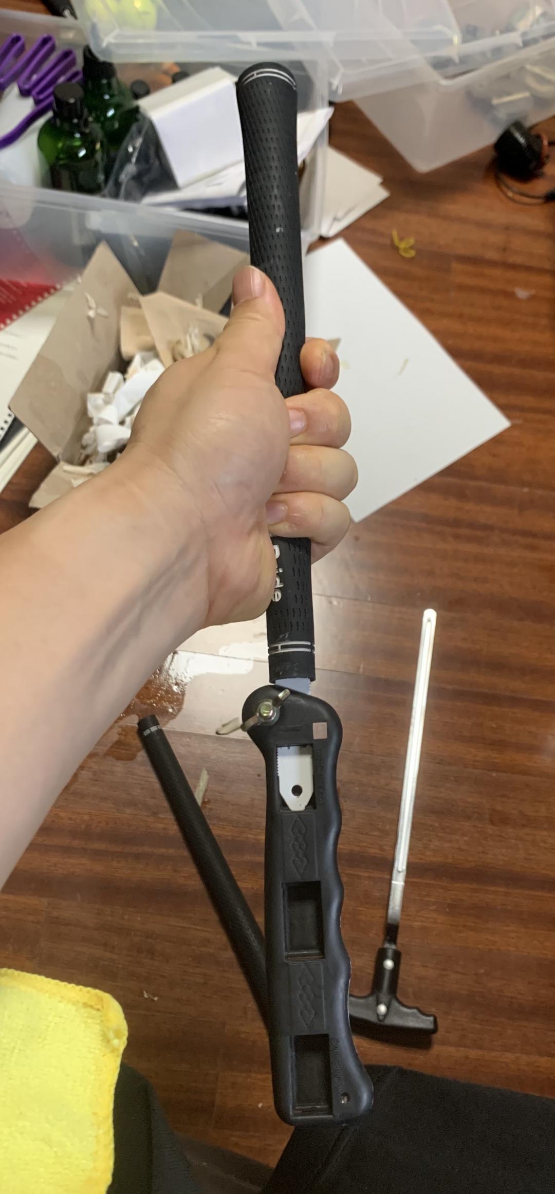 그립내부의 양면테입들이 슬슬 녹았다고 판단되면 솔벤트를 부어버리거나 여튼 흐르지 않도록 처치 한 후 레녹스 톱날 + 중국산 톱대 조립품을 그립에다 밀어넣고 그립의 반대편 끝부분을 잘 아시는대로 계란이 깨지지 않을정도 내지 작은 새를 쥐는 정도로 견고하게 잡은 다음 ㅋㅋ 톱대를 빙글빙글 돌리는 가운데 아래쪽으로 빼 냅니다.