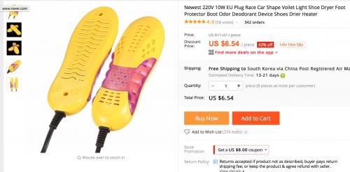가격은 6.54불 이고 한국에 팔고 있는 신발건조기 최저가가 9천원정도 인거 같은데 한참 구형인듯합니다.