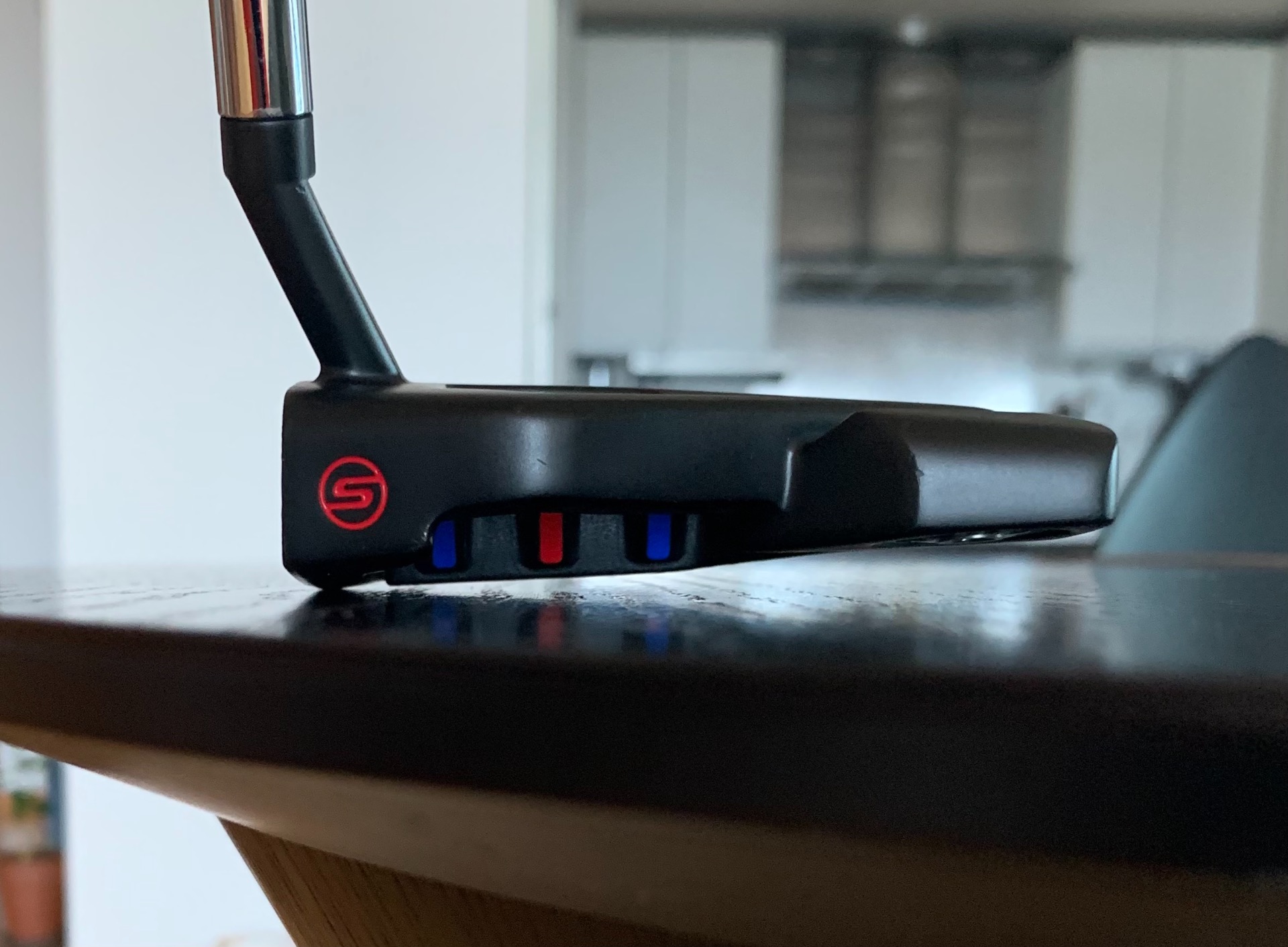 추가로 퍼터 바닥을 지면과 수평으로 만드니, 샤프트는 살짝 왼쪽을 향하게 되면서 볼의 위치를 왼발 앞에 두어야 편한자세가 되더라고요…