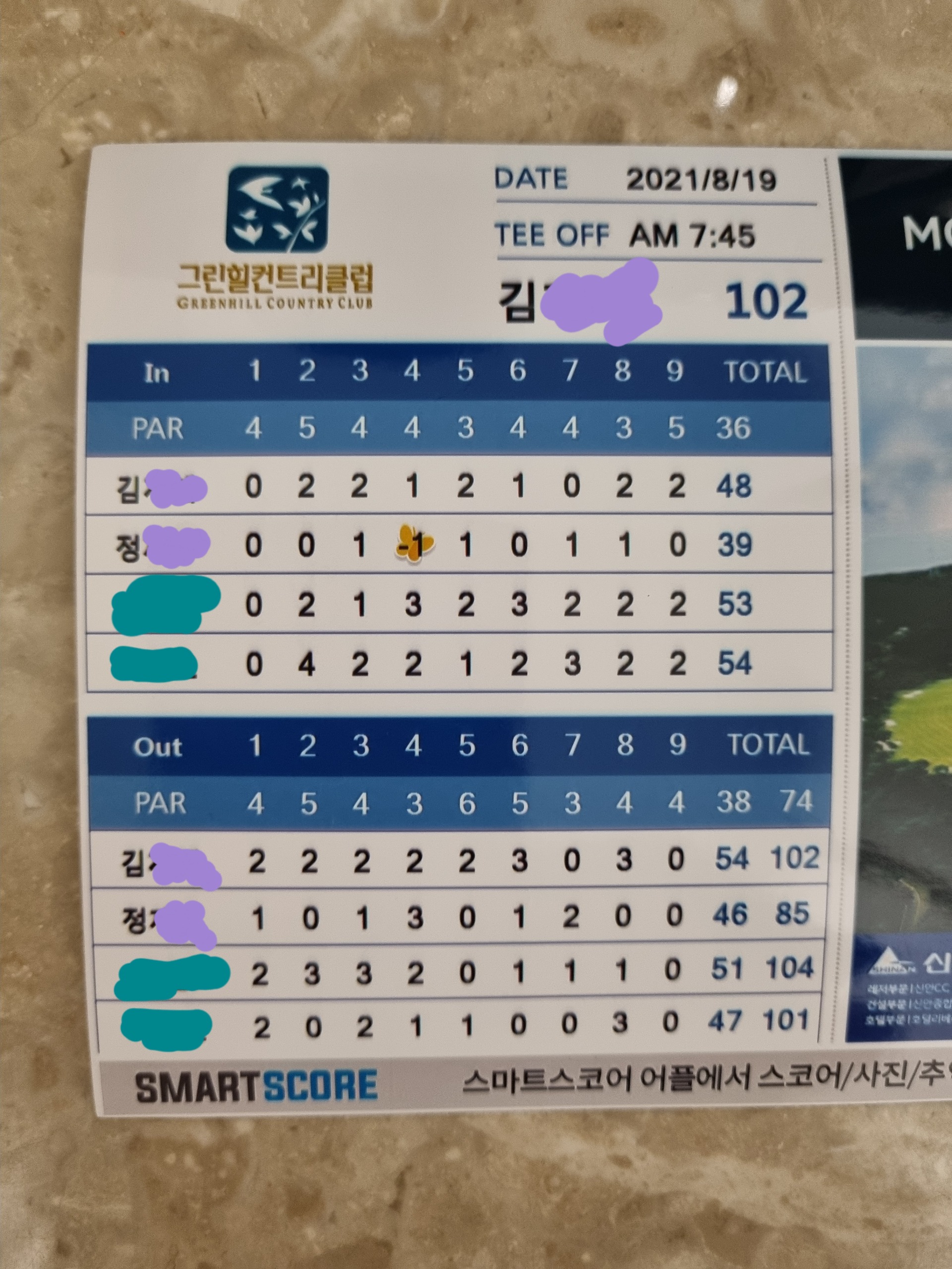 날씨도 너무 좋고 와이프가 생각보다 잘쳐서 저도 재밋게 다녀왔습니다. 1번홀 일파만파만 제외하고 제 생각엔 그대로 스코어를 적은걸로 알고있어서 스코어카드 맨위의 와이프점수가 무쟈게 놀랍네요;;; 드라이버가 한번도 안죽어 첫 18홀 플레이에 원볼플레이하고 저 초보때보다 훨씬 잘치네요ㅜ(자괴감..)