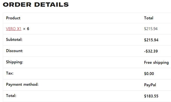 6박스를 주문하고 앞서 언급한 코드를 입력하면 위와 같이 183.55불이 되므로 1박스에 30.59불이 되네요 (저도 이방법을 진작 알았으면 좋았을텐데요 ㅠㅠ)
