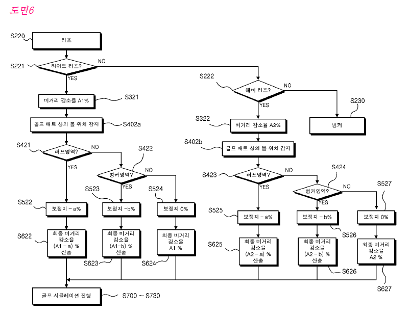 골프존 특허 중 상업적 가치가 높은 특허 중 하나로 보여지네요. 도 6의 플로우 차트는 단지 예시일 뿐이고, 청구항 1의 권리범위가 상당히 넓어서 카카오가 회피하기는 어려울 듯 합니다. 이 특허를 죽이려고 SG골프랑 카카오랑 대법원까지 가는 싸움을 했는데 골프존이 다 이겼네요. |