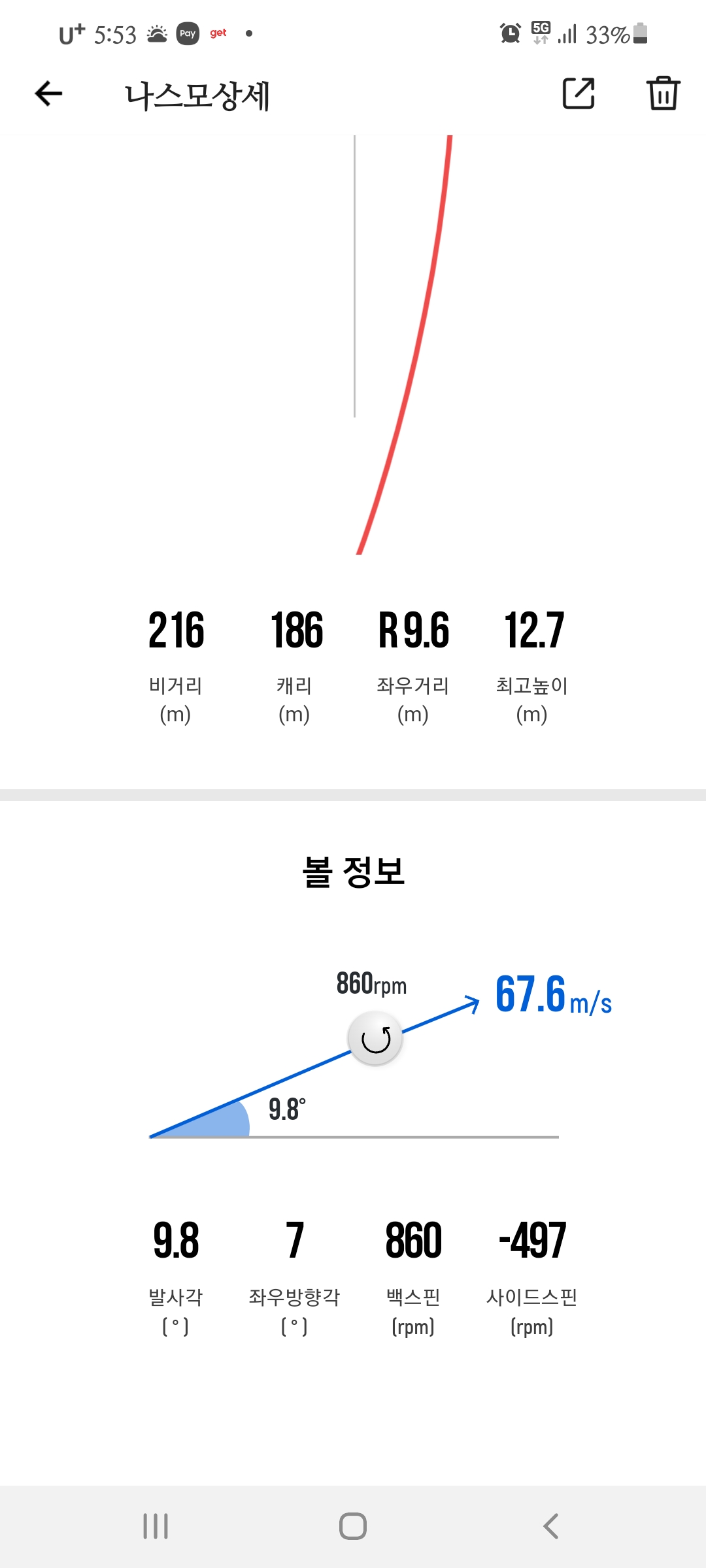 - 볼스피드 : 69m/s, 탄도 : 12도, 캐리 :208m, 체공시간 : 5초대