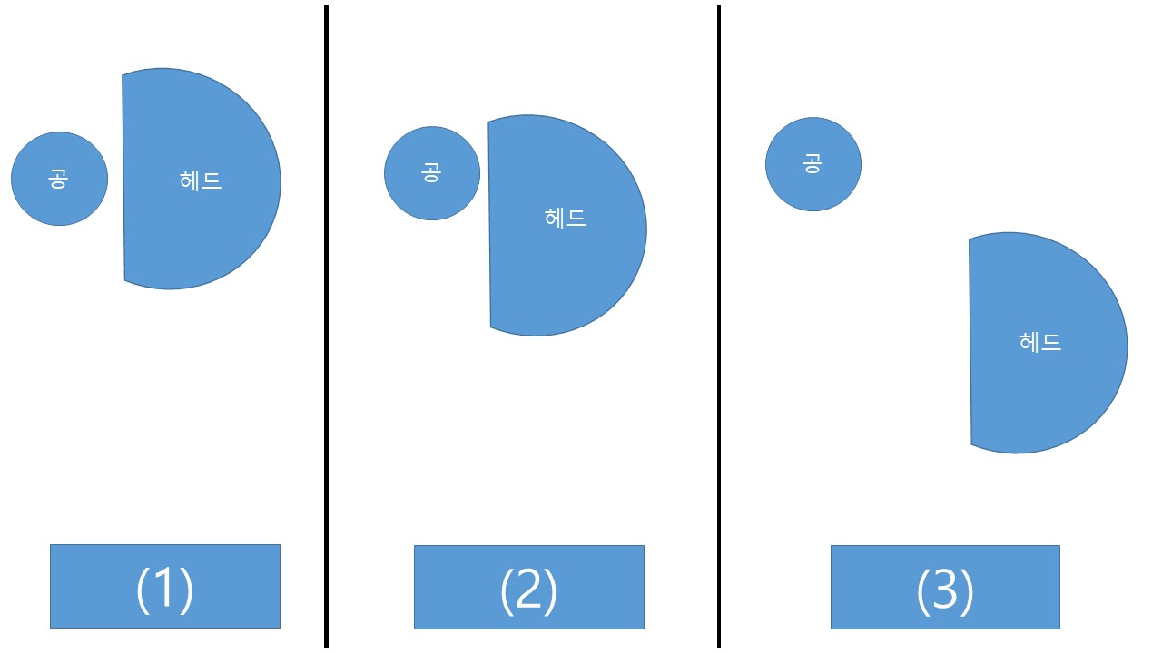 헤드를 지면에서 띄웠을때, 공이 헤드의 힐쪽에 위치 한다하여