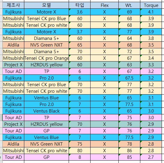 요즘 텐세이 프로 블루 60R 사용하는데 5s 정도 무게라 부담스럽지 않고 스탁제외 5s 샤프트보다 토크는 낮지만 타감이 부드러워서 주력으로 사용하고 있네요. 볼스 평균 63 정도 나옵니다. | ||