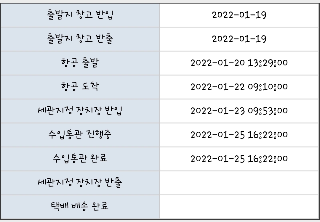 내일이 고비네요.. 내일 오전에는 픽업이 되어야 올텐데요. 제건 어제 델라웨어 배대지 들어왔네요.. 설연휴 다음주라도 왔으면 좋겠어요.. |