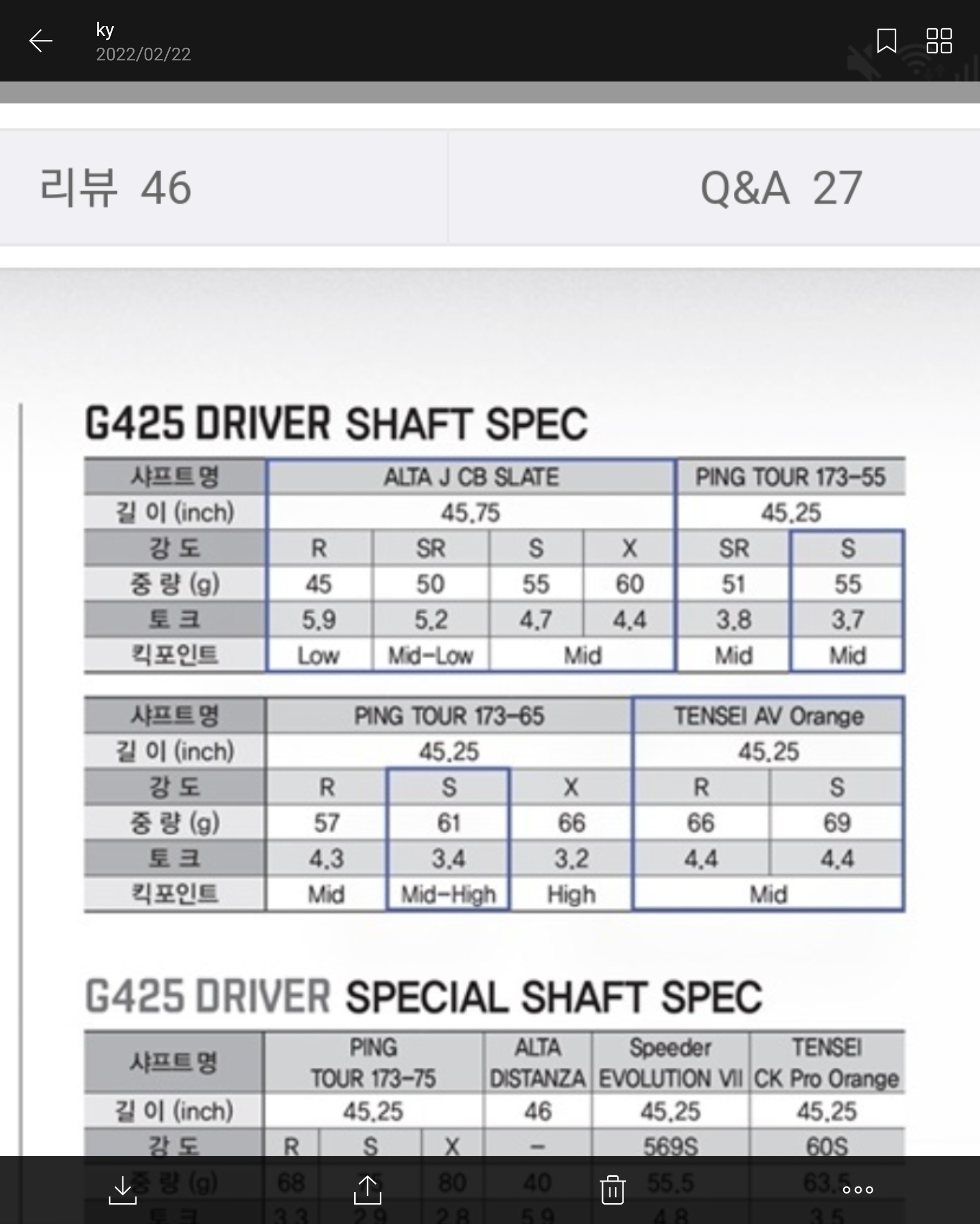 핑 투어 173-65S 쓰다가 벤투스 블랙 5S 구매했는데 5S임에도 차이가 큽니다