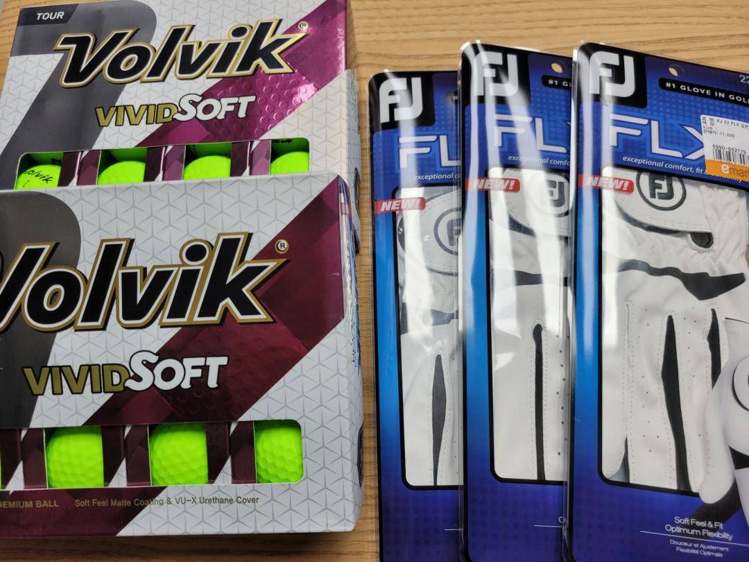볼빅 비비드 사용했었는데 좋았었고 이번에 가격도 착해서 구입했습니다. 풋조이 장갑은 양피가 제게 맞는 사이즈가 없어서 합피로 담아 왔습니다.