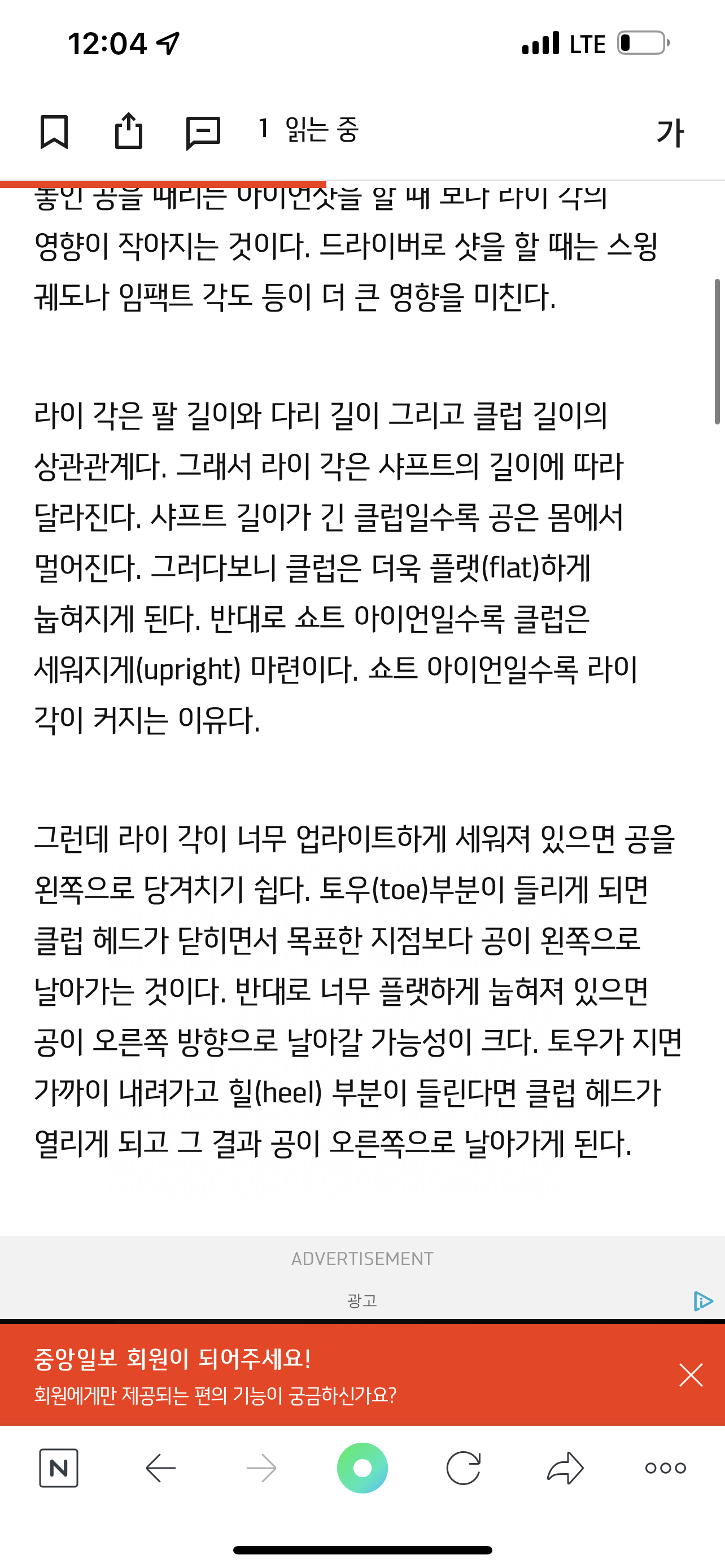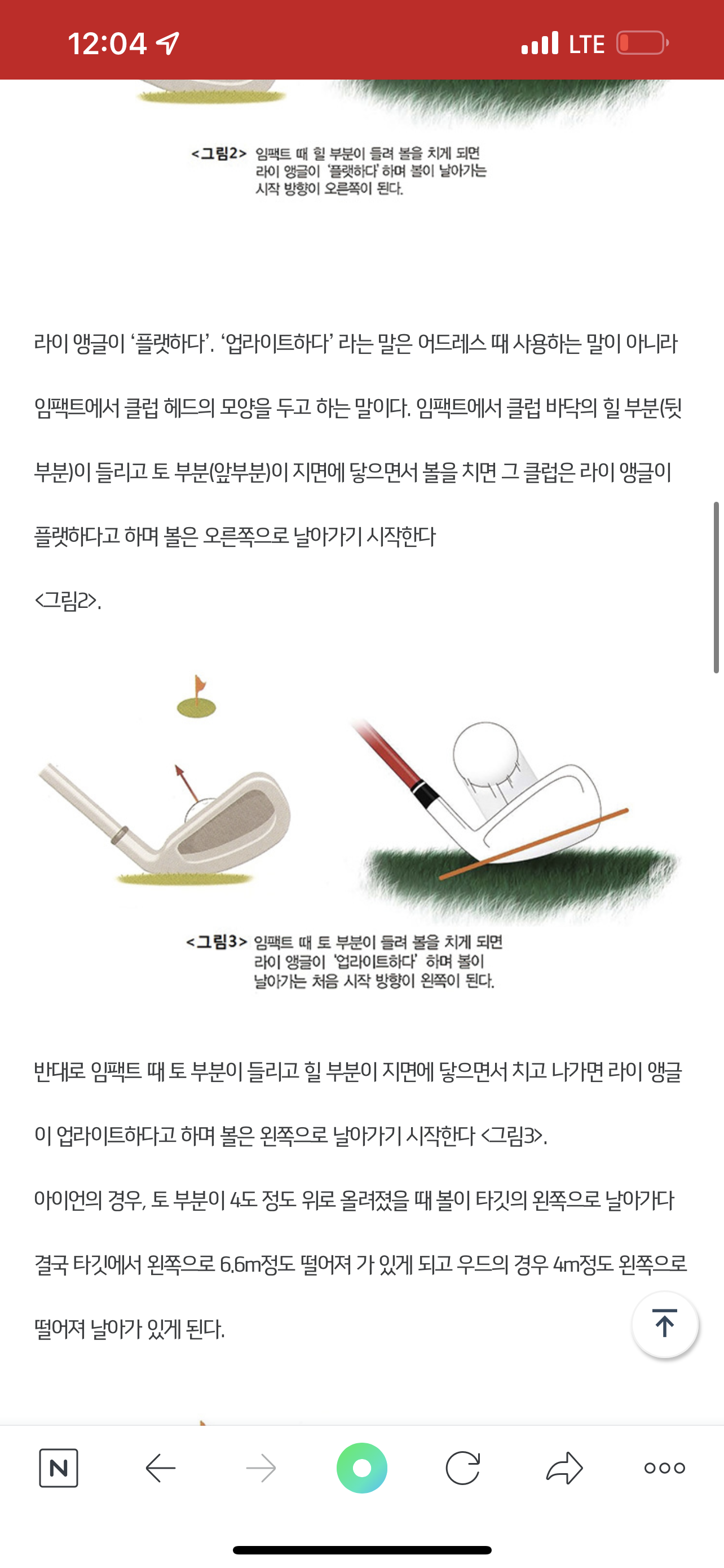TMI하나만 추가드리자면 동적 라이각 혹은 다이나믹 라이dynamic lie각 이라는 피팅개념이 따로 있습니다. 정적 라이각은 위에 말씀드린대로 정해진 측정자세에 클럽을 놓았을 때의 라이각인대요, 동적 라이각은 1)임팩트시 손 위치 변화와 2)샤프트의 휘어짐(drooping) 때문에 클럽헤드 바닥이 놓이는 각도가 변하는 상황을 측정하는 개념입니다. 이건 사진 혹은 눈으로 보는 게 아니라 바닥sole에 스티커나 잉크 표시 후 실제로 쳐보면서 토 힐에 균등하게 바닥 접촉이 일어나는지를 비교해보는 방식입니다.
