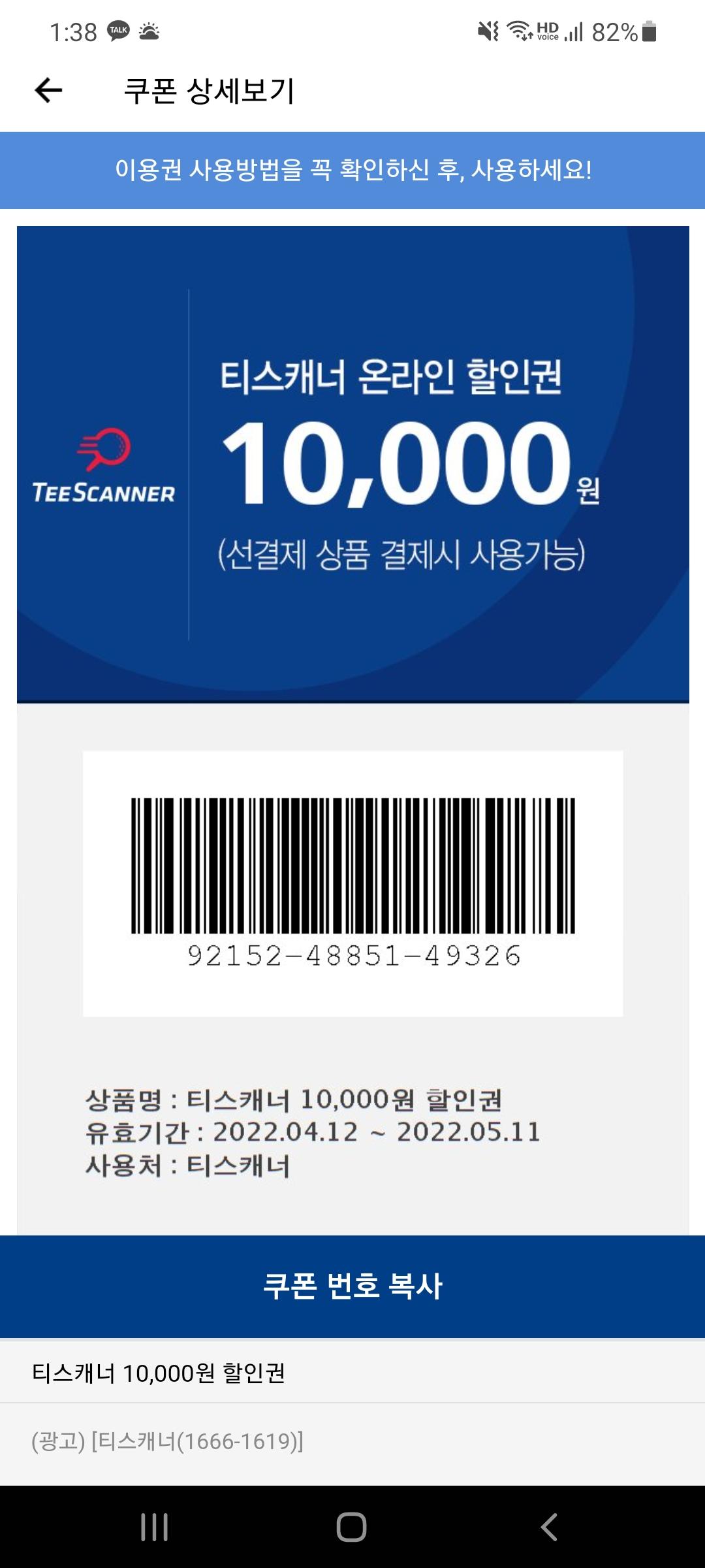 혹시 필요하신 분 있으시면 티스캐너 온라인 할인권