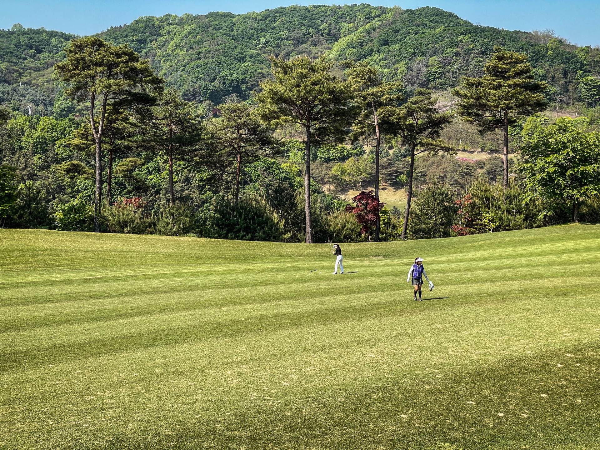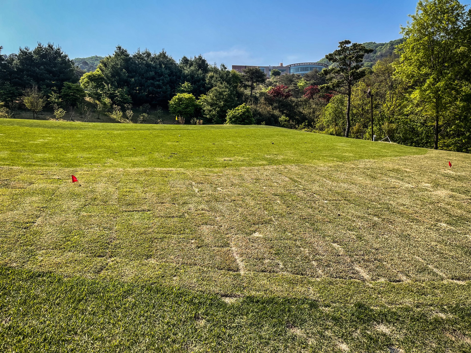 중지가 아직 누런 부분이 군데군데 있긴한데 많이 올라왔습니다. 디봇 관리도 평균이싱은 되어보이고요. 러프는 워낙 짧께 쳐놔서 사실상 페어웨이와 구분이 없다고 보셔도 됩니다. 카트도로와 러프/페어웨이 경계부분은 잔ㄷ가 없고 바닥이 드러난 부분이 좀 있네요. 도로 떨어진 공 드롭할때는 좀 피해야할 것 같습니다.