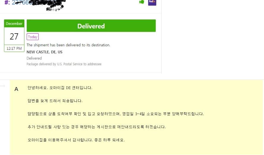 28일날 배송 완료 뜨고 개인사서함번호 안적어서 문의사항에 올려놨는데 오늘 답변왔네요.