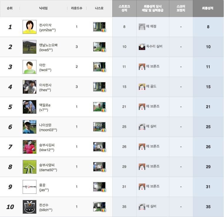 순위표상 1위는 남자회원님께서 여성분 아이디로 플레이하셔서 제외하고 맨날노는오빠님이 1위를 하셨습니다.