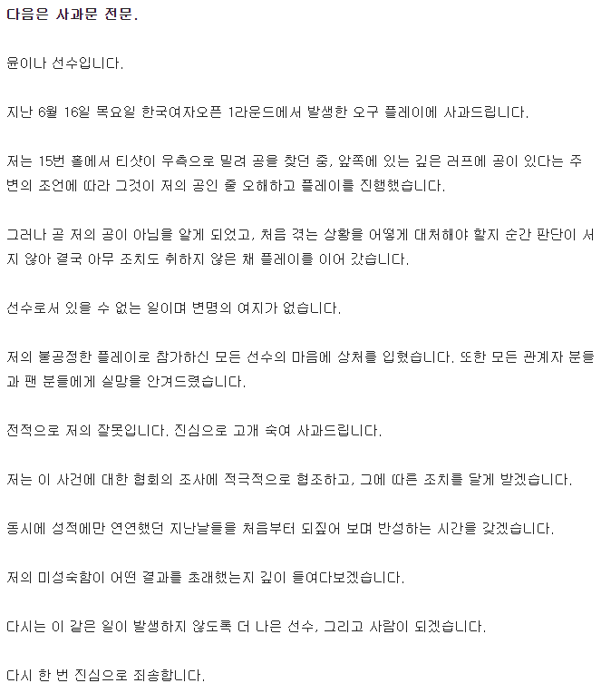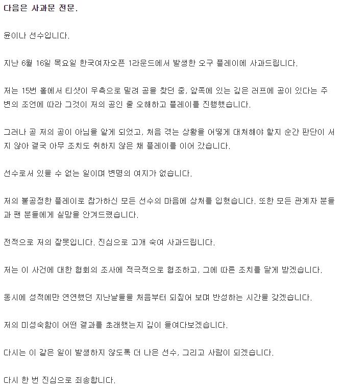 ' 대한골프협회에 따르면 윤이나는 지난 달 16일 충북 음성의 레인보우힐스CC에서 열린 대회 1라운드 도중 15번 홀 그린에서 자신의 볼이 아닌 볼로 플레이한 사실을 알게 됐으나 이를 한달여간 숨기다 자진신고했다. 당시 동반 플레이어는 마다솜과 권서연이었으며 윤이나가 플레이한 오구는 동반자들의 볼이 아닌, 러프에 버려져 있던 볼이었다. 윤이나의 룰 위반 사실은 캐디와 결별하면서 흘러나왔다는 후문이다.'