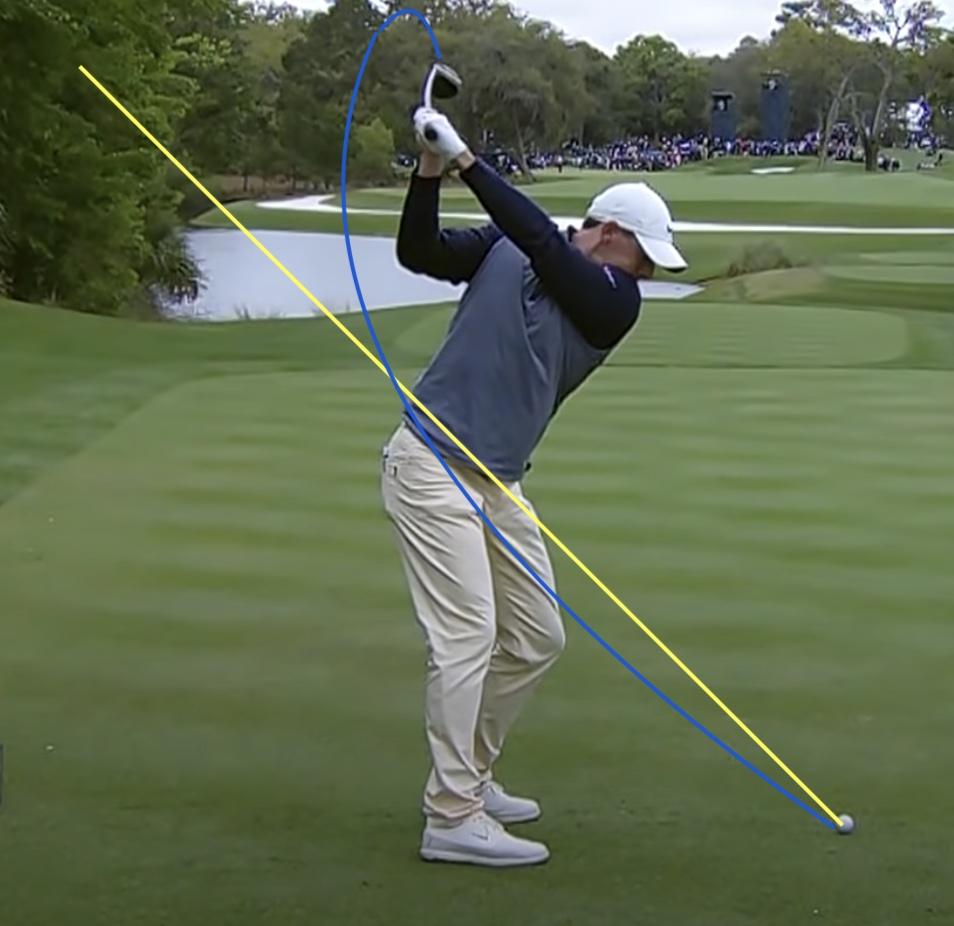 이 사람은 외회전 백스윙이라고 부르는데 아무튼 비슷하게 높이 올라가니 다운스윙이 더 완만해졌습니댜.