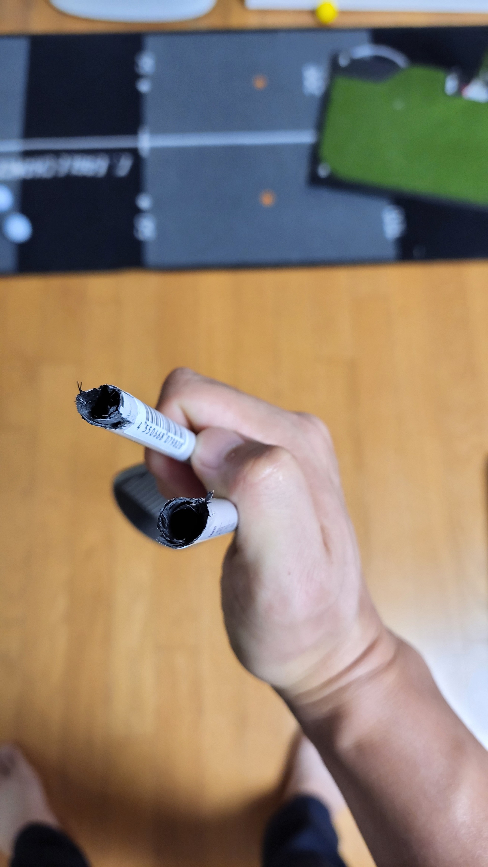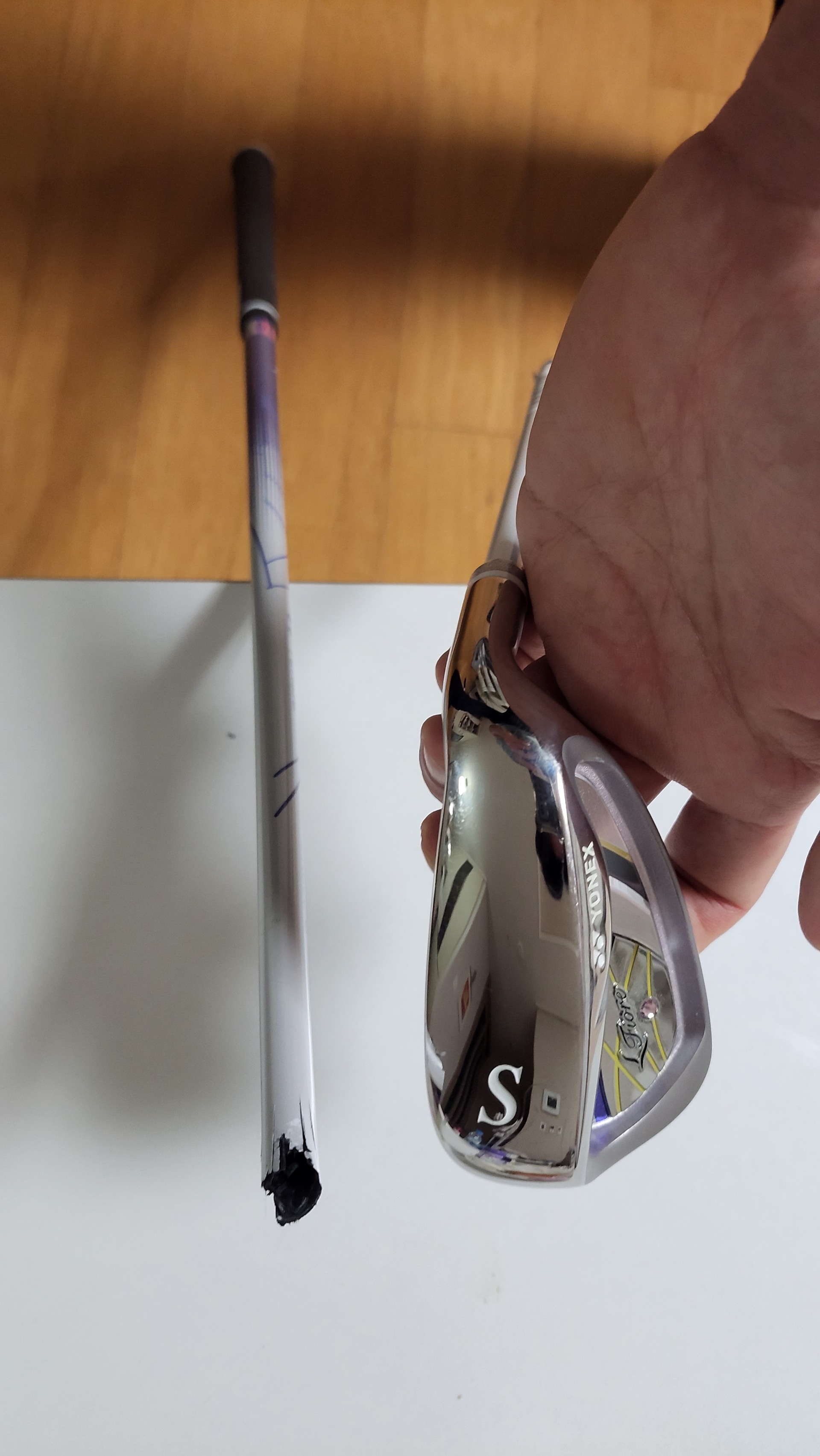 부러지는 모습을 직접 본건 아닌데 그냥 가볍게 어프로치 연습하다 모서리에 부딛쳐 부러진것 같다고 하네요(집안 거실이라 풀스윙이나 새게 칠레야 칠수도 없어요)