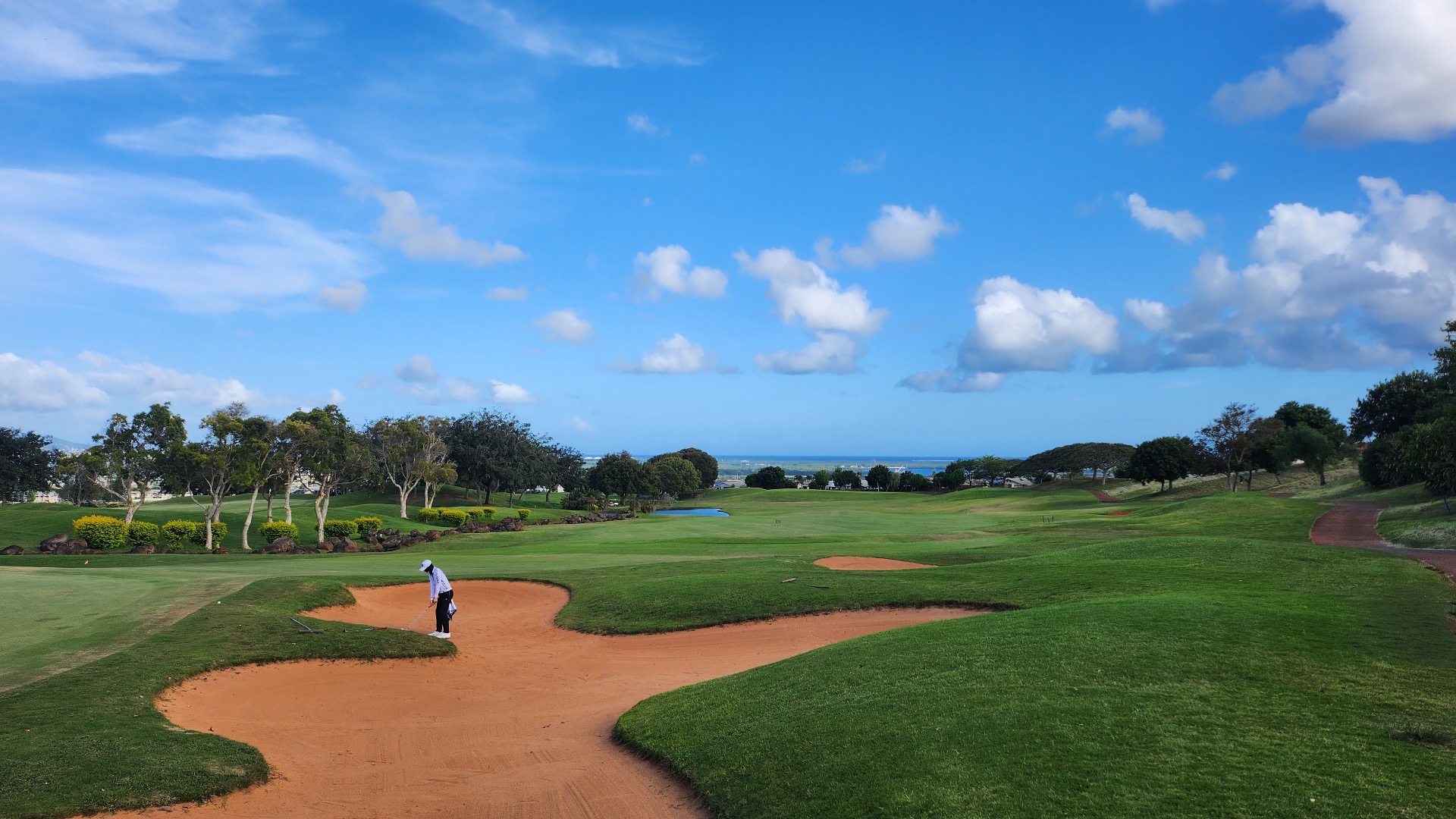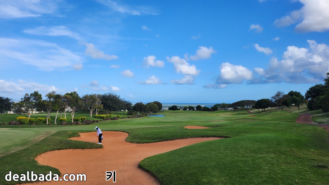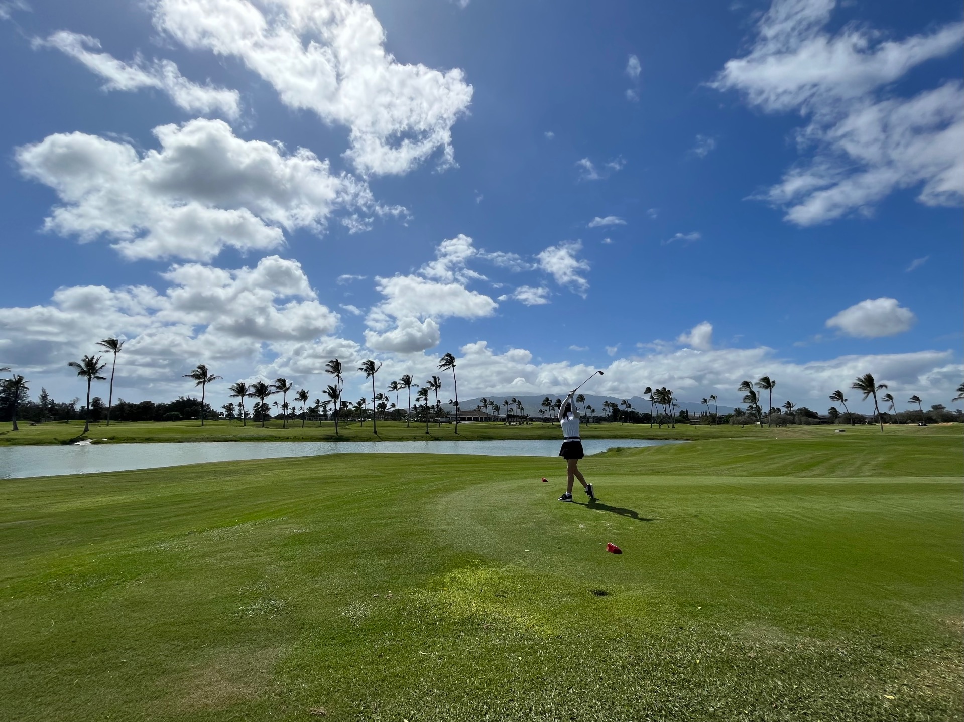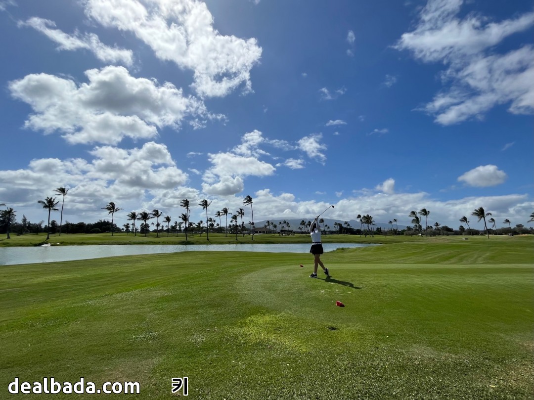 하와이 특유의 청량한 하늘 아래 키높은 야자수가 즐비한 초록빛 페어웨이 한가운데 서 있자니 너무 환상적이라 마치 가상현실 속에 있는 느낌이었어요. ㅜㅜ