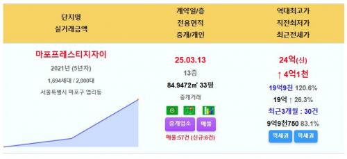 마포프레스티지자이 34평 24억 마포구 국평 돌파 신고가