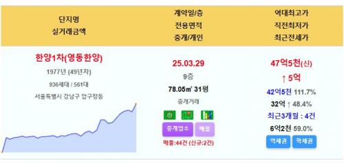 한양1차 31평 47.5억 신고가 (토허제 이후)