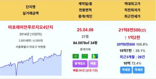 마포구 마포래미안푸르지오 34평 21.85억 신고가