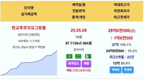 판교푸르지오그랑블 36평 28.65억 분당 국평(?) 돌파