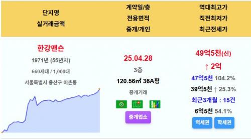 용산구 한강맨숀 36평 49.5억 신고가