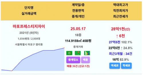 마포프레스티지자이 34평 25.5억 신고가 마포 국평 최고가 돌파