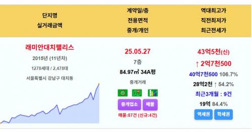 강남구 래미안대치팰리스 34평 43.5억 신고가