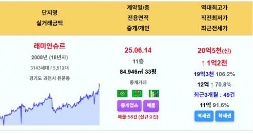 과천시 래미안에코팰리스 33평 19.7억 신고가