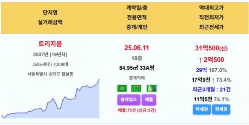 송파구 트리지움 33평 31.05억 신고가