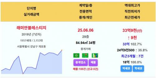 강남구 래미안블레스티지 34평 33.9억 신고가