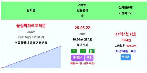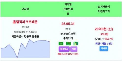 올림픽파크포레온 대량 실거래 신고가가 떴네요 ??